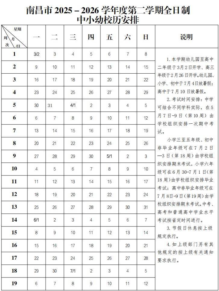 江西全省高三年级统一于2月26日开学,幼儿园、小学、初中及高一、高二年级统一于3月2日正式上课。春季学期总时长19周,减去假期和周末后,实际教学天数同样低于90天。
