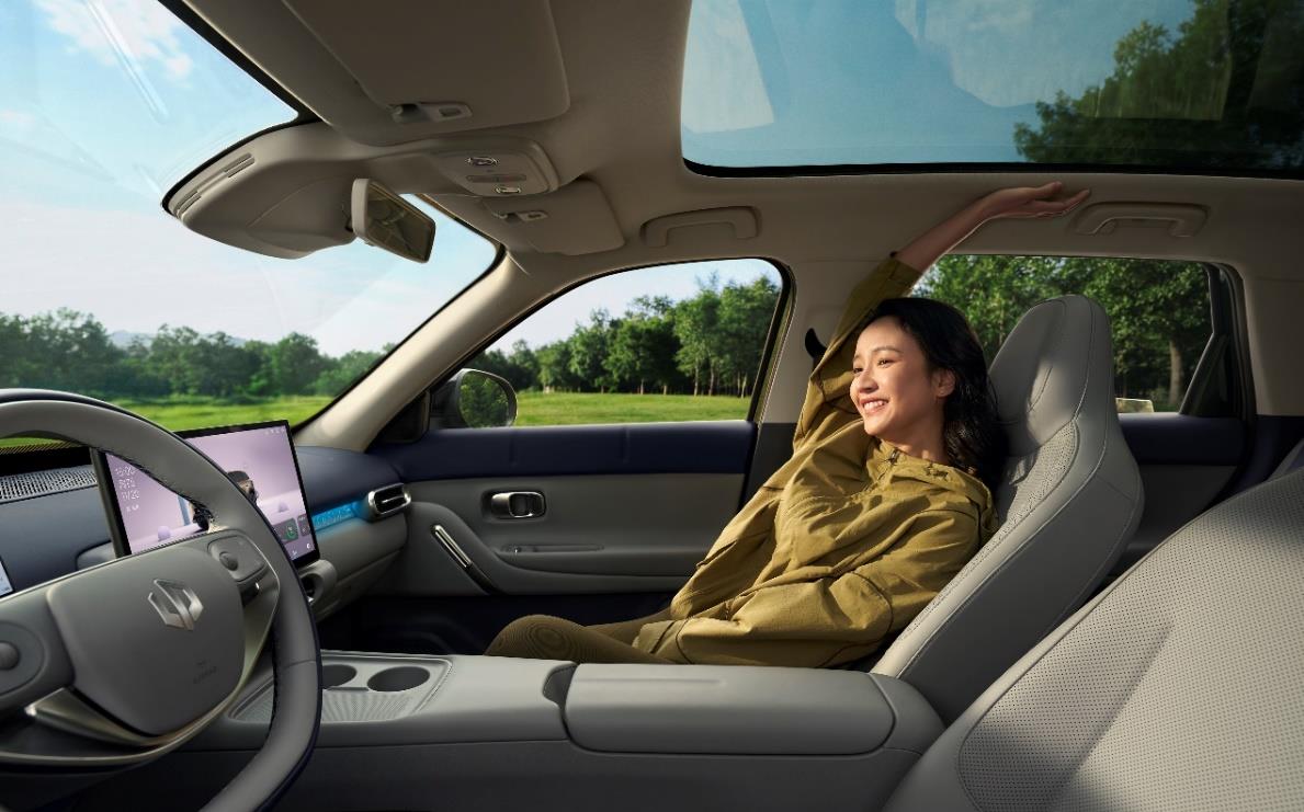 造型也不拉胯。1.55㎡全景天幕配电动遮阳帘,2.63㎡软包内饰,座椅面料达到欧盟OEKO母婴级认证,婴儿皮肤直接接触也没问题。六种自然灵感车色,三段式“嘻嘻/哈哈”情绪灯组,看起来不像这个价位的车。